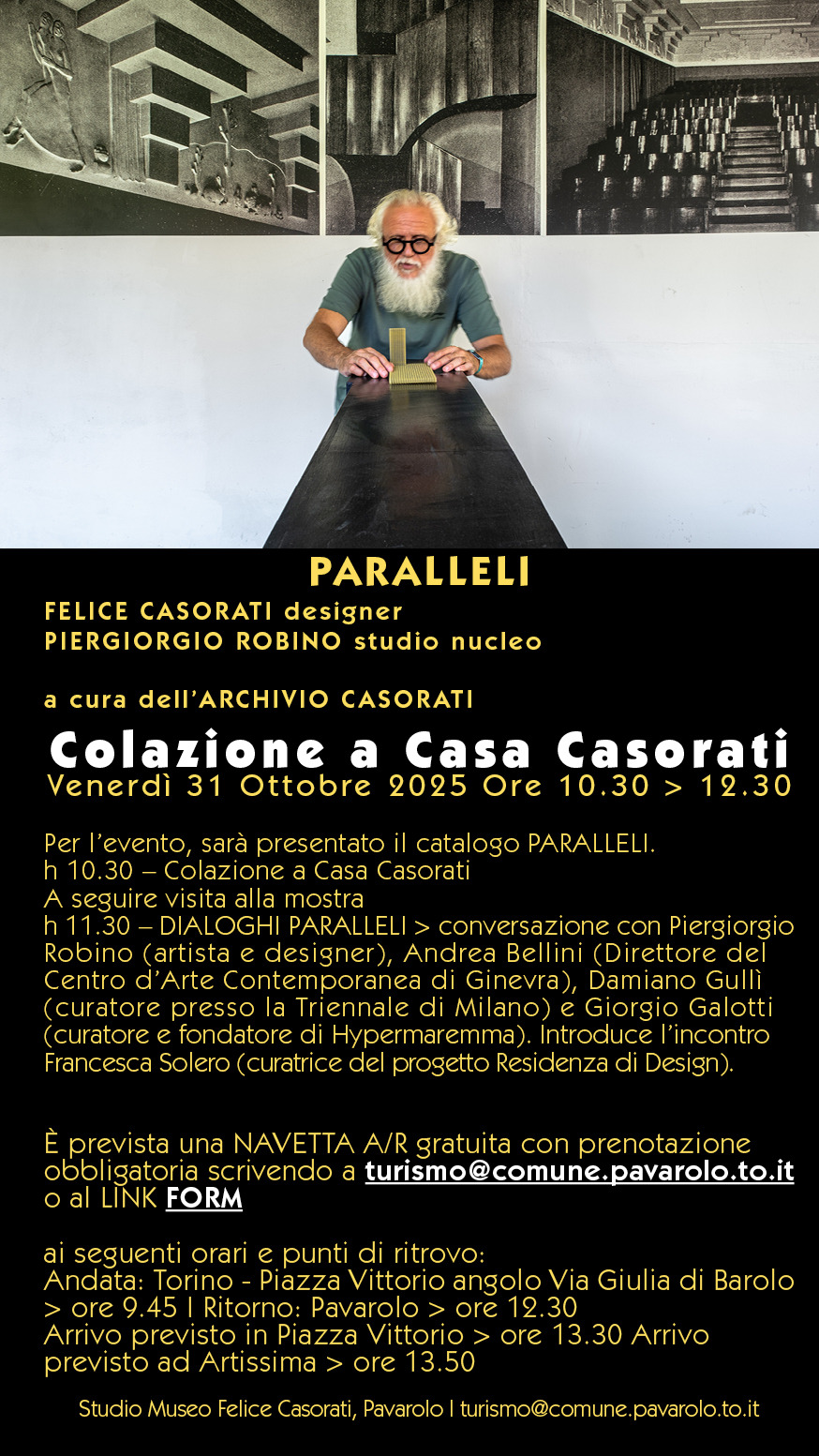 Non perderti, venerdì prossimo, la Colazione a Casa Casorati in occasione della mostra FELICE CASORATI DESIGNER / PARALLELI / PIERGIORGIO ROBINO STUDIO NUCLEO presso lo Studio Museo Felice Casorati.